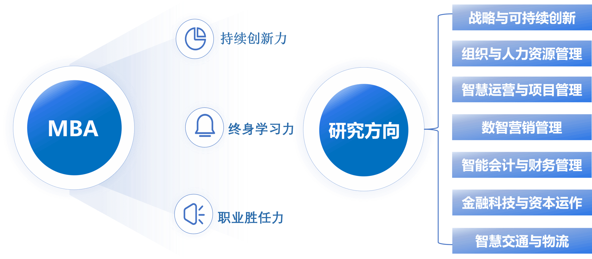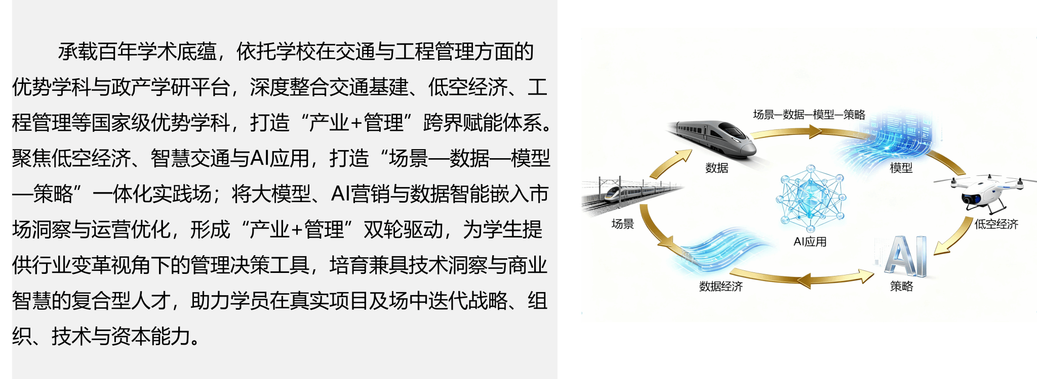 培养目标:始终秉承学校“交通天下”的办学使命,依托学校强大的工科背景和鲜明的交通运输行业资源优势,围绕国家“一带一路”和成渝地区双城经济圈建设的重大战略需求,致力于培养胸怀家国情怀、具备全球视野和卓越领导力的新时代商业领袖。