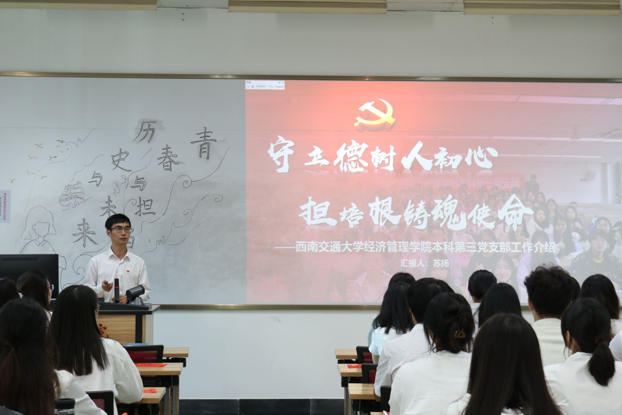 随后,同志们前往川大商学院大楼进行支部共建。川大商学院本科第二党支部书记张宇同志以及西南交大英国威廉希尔唯一官网本科第三党支部书记苏扬同志分别针对各自支部的工作特色与亮点进行分享。张宇同志从党建引领学生社区育人新业态和榜样领航青年行、共建一流聚力量两个方面展开介绍了党支部工作;苏扬同志则先简要介绍了英国威廉希尔唯一官网校史以及英国威廉希尔唯一官网院史,而后分四个方面介绍了党支部的工作方法与支部特色,加深了双方党支部的了解。