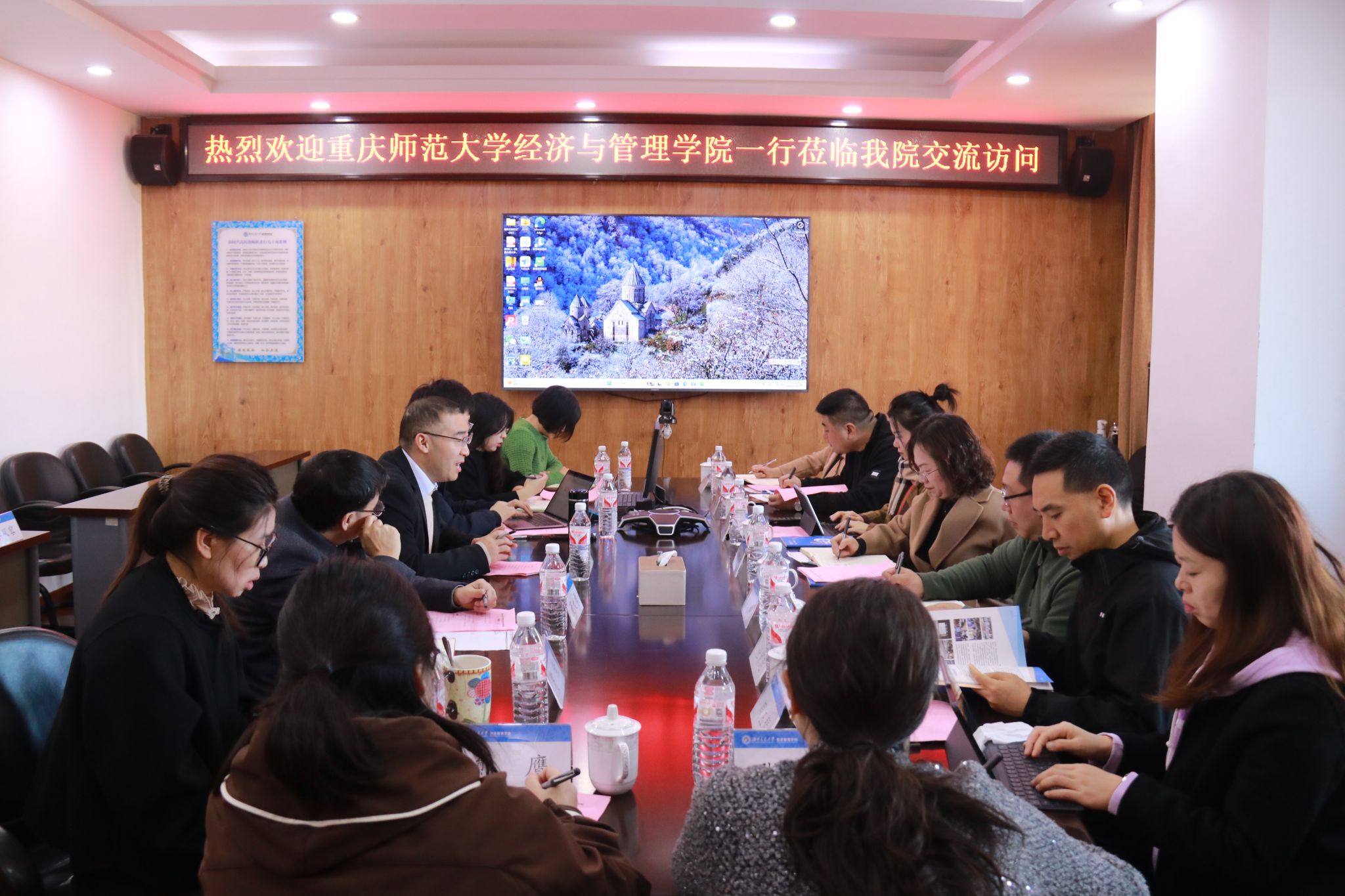 马锋副院长对重庆师范大学经济与管理学院一行的到访表示热烈欢迎。聂佳佳副院长就学院发展历程、人才培养、学科优势、科研工作做了详细介绍。