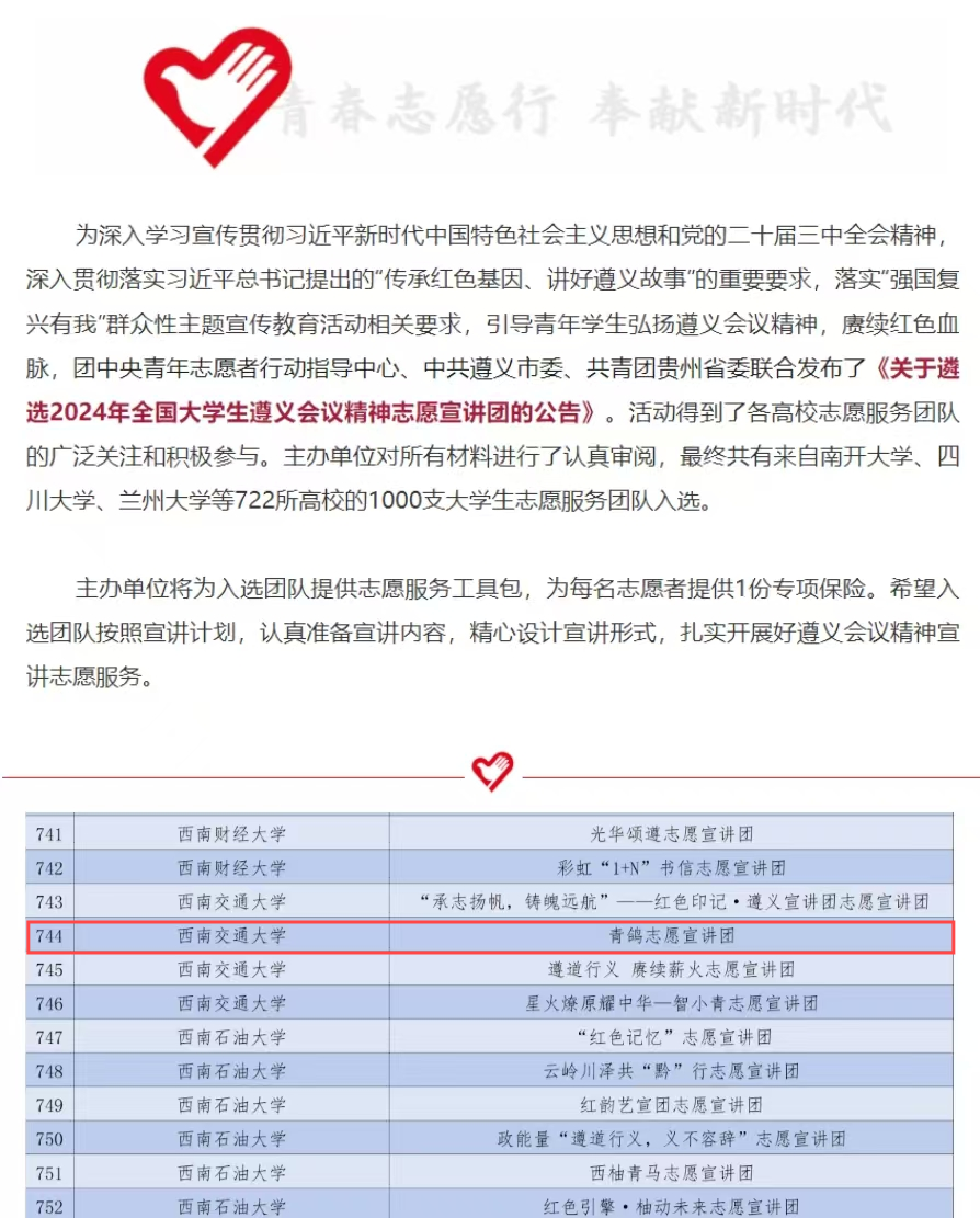 为深入学习宣传贯彻习近平新时代中国特色社会主义思想和党的二十届三中全会精神,深入贯彻落实习近平总书记提出的“传承红色基因、讲好遵义故事”的重要要求,落实“强国复兴有我”群众性主题宣传教育活动相关要求,团中央青年志愿者行动指导中心、中共遵义市委、共青团贵州省委面向全国高校遴选2024年全国大学生遵义会议精神宣讲团。