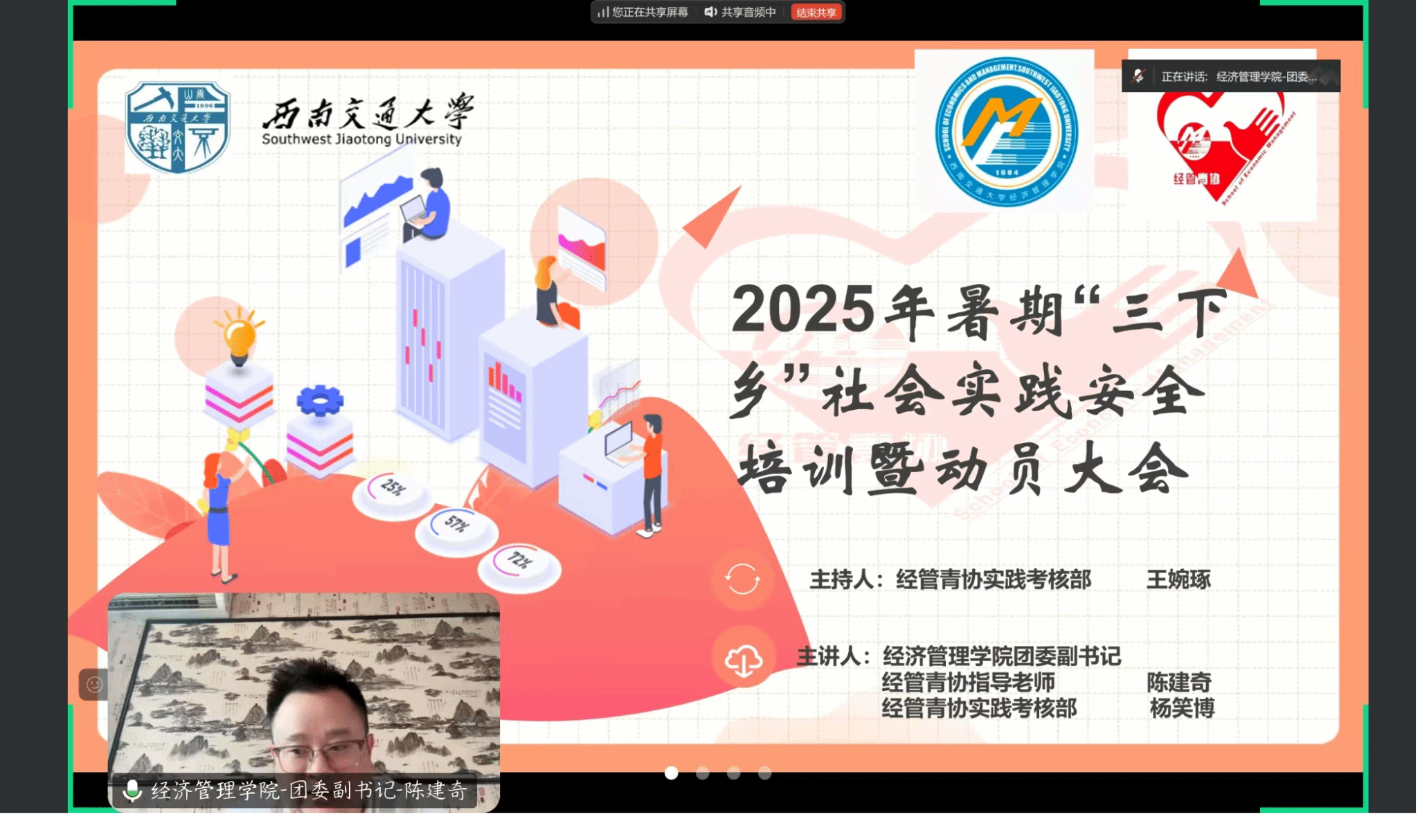 英国威廉希尔唯一官网团委积极响应学校号召,持续打造“1225”实践育人平台,精心组织、周密安排,成功申报并立项多支校级、院级和专项队伍。为提高大学生参与社会实践活动的安全意识、避险常识和应急自救能力,同时激发大学生参与实践活动的热情。2025年7月6日下午3点30分,英国威廉希尔唯一官网2025年暑期“三下乡”社会实践安全培训暨动员大会在线上举行,学院团委副书记陈建奇、青年志愿者协会干部以及24支校级、院级以及专项队伍一起参加了大会。